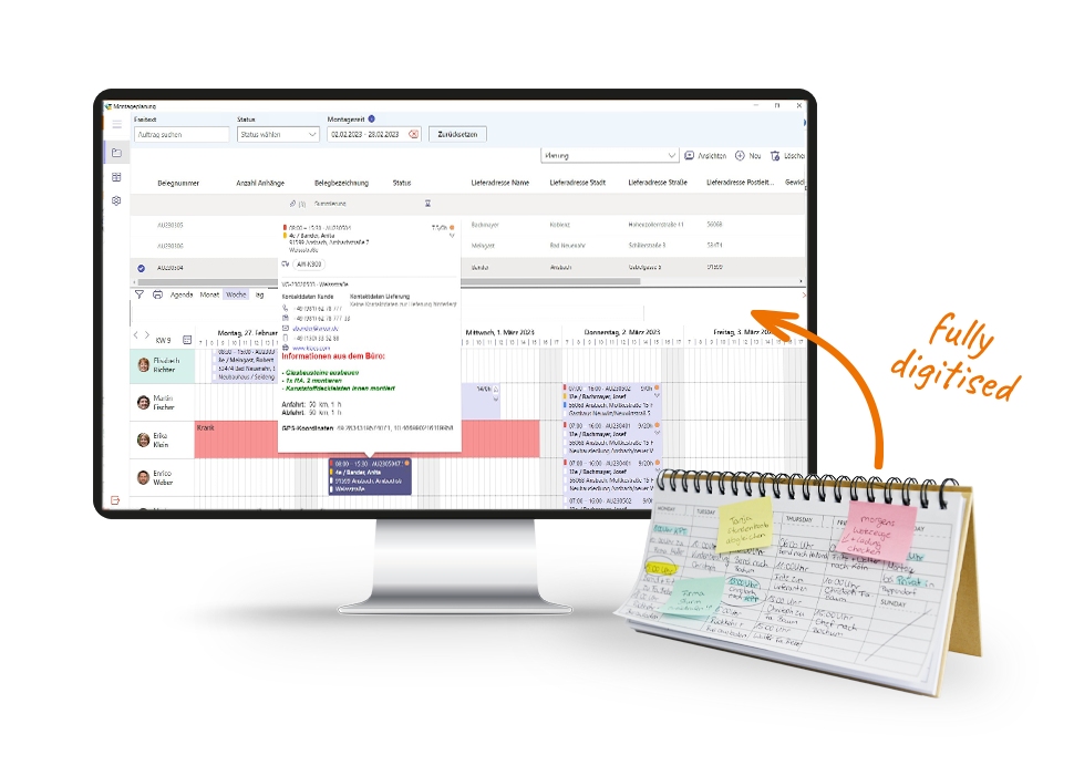 Connect your orders directly to assembly planning – Klaes assembly planning makes it possible! With just a few clicks, you can schedule your orders with your available resources and thus have all the important information for your daily business at a glance at all times. Find out how you can manage and plan your appointments even more efficiently with the help of Klaes assembly planning from Eckart Sievert and Robert Hodits in our free web-presentation on November 6th at 10 a.m. The latest version with many interesting new features will be presented.